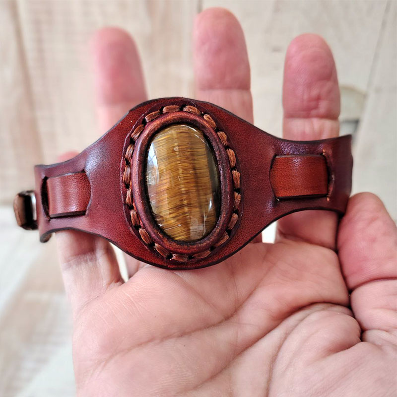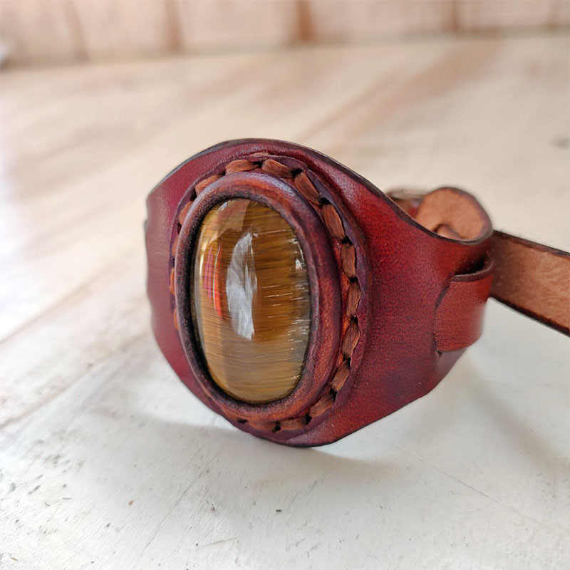 Descubre la fuerza interior que aporta esta pulsera de ojo de tigre, elaborada a mano con cuero de curtido vegetal 100% natural. Una pieza con alma, poderosa y sostenible, ideal para quienes buscan protección, enfoque y energía positiva.