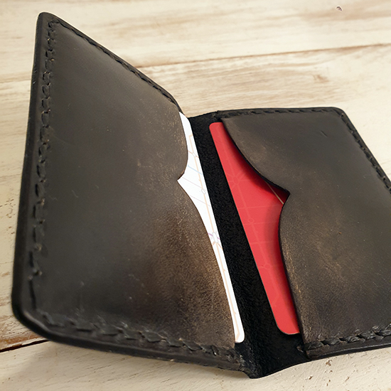 Tarjetero minimalista con capacidad inicial para 2 tarjetas. Puedes colocar 2 tarjetas a cada lado, y con el uso, el cuero se adaptará para acomodar más si es lo que buscas.